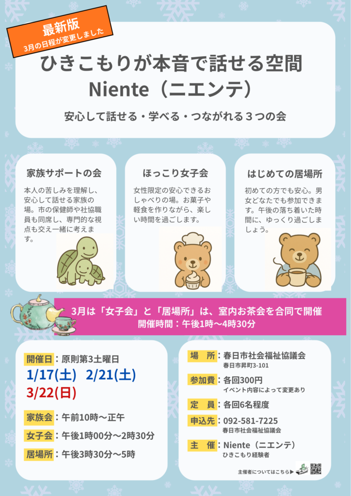 Niente(ニエンテ)は、福岡県春日市で活動している、ひきこもり当事者活動団体です。