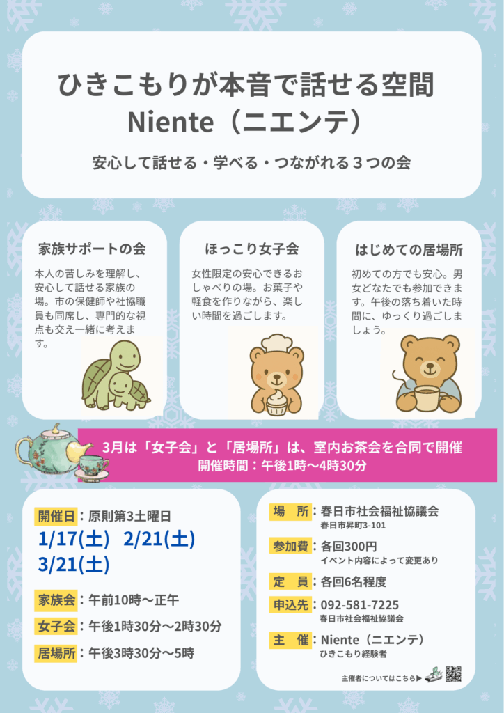 春日市のひきこもり家族会と居場所|Niente(ニエンテ)の3つの会