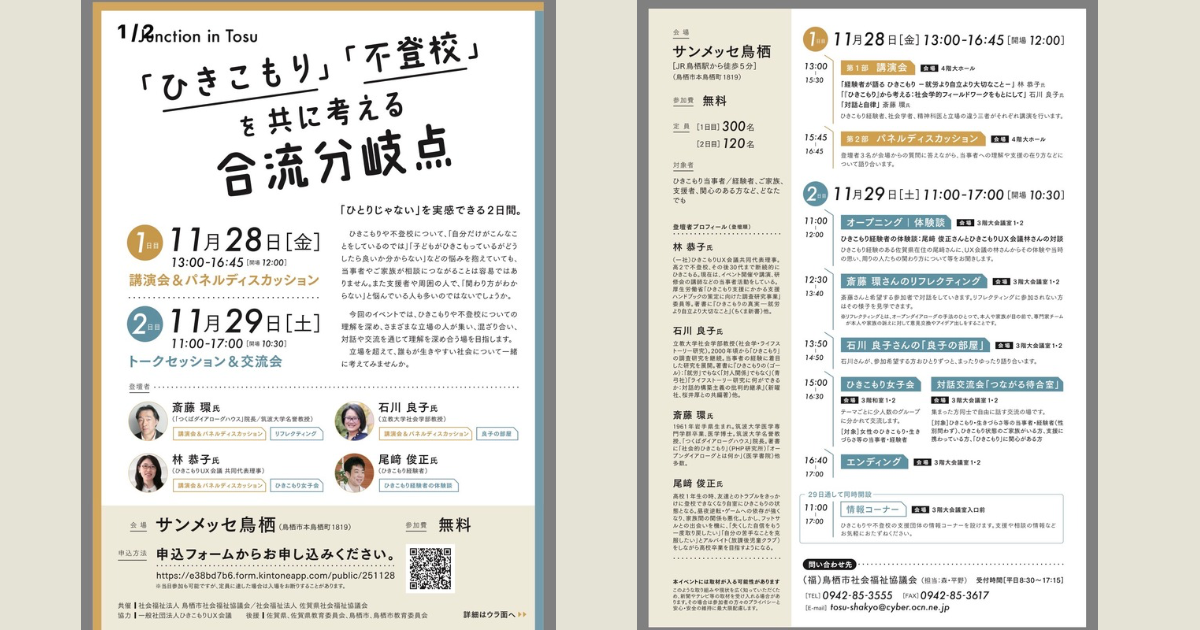 2025年11月28日〜29日、佐賀県鳥栖市の サンメッセ鳥栖 で開催された「ひきこもり・不登校を考える講演会・対話プログラム」 に参加しました。