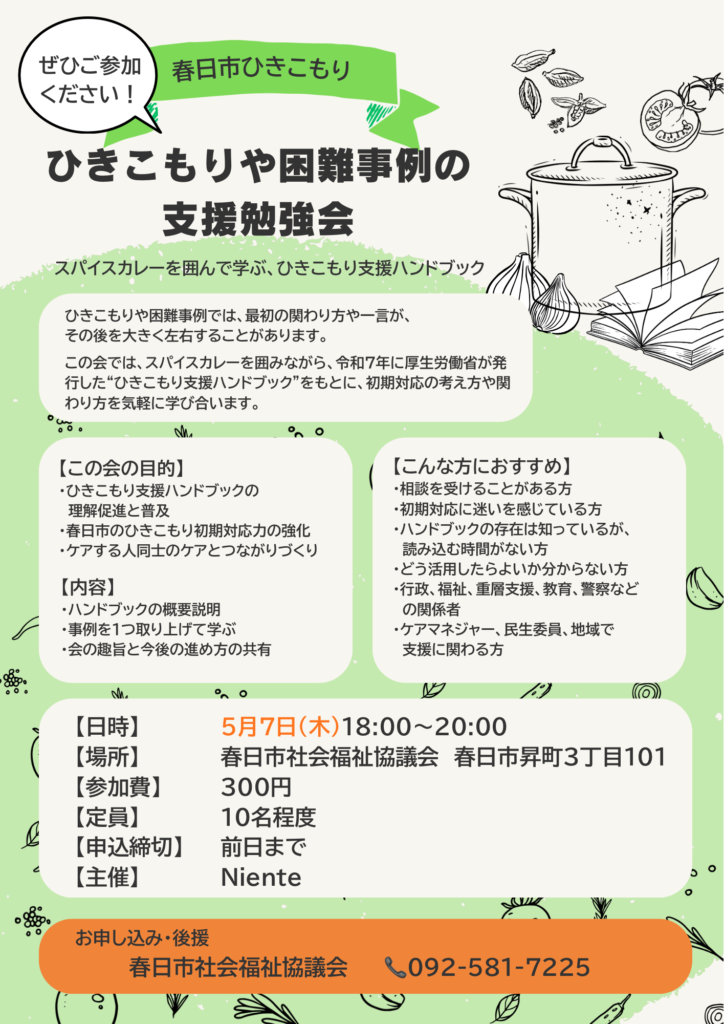 ひきこもり支援では、すぐに答えが出るわけではないからこそ、安心して話せる場と、経験を通して学び合える場が大切です。今後も福岡・春日市近郊で、こうした家族会と居場所を継続していきます。